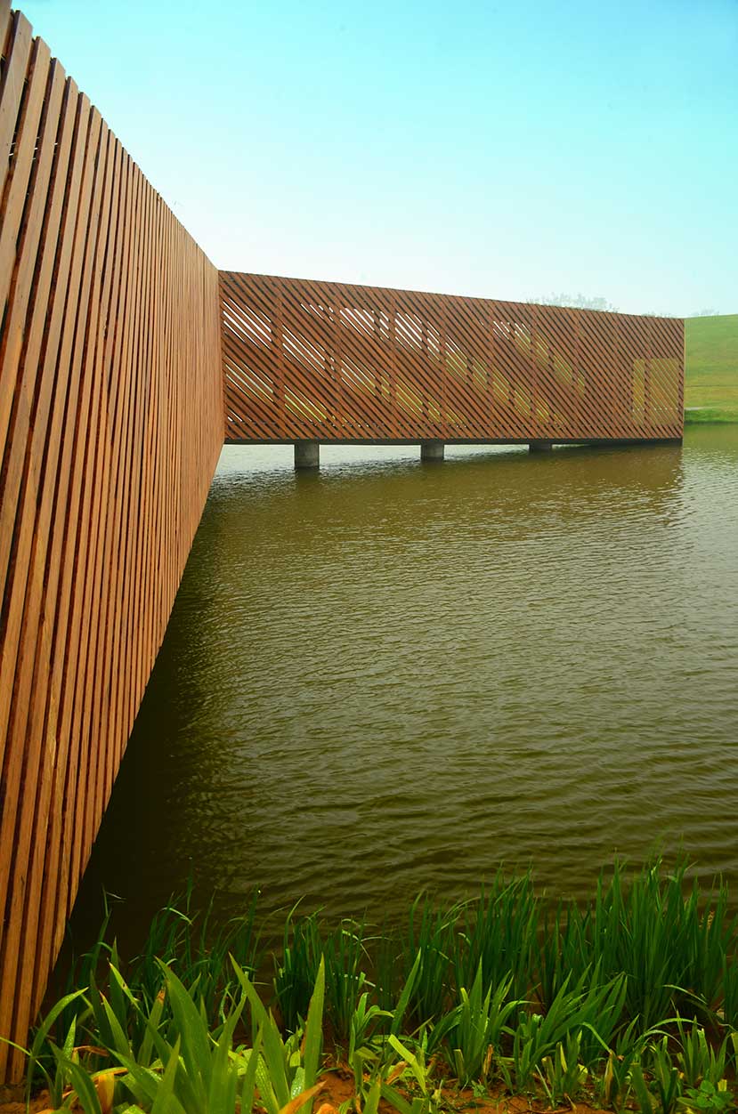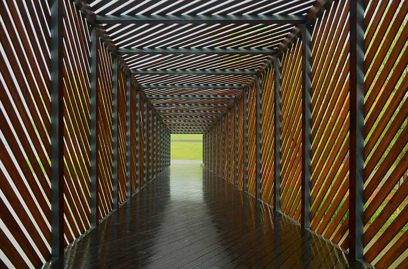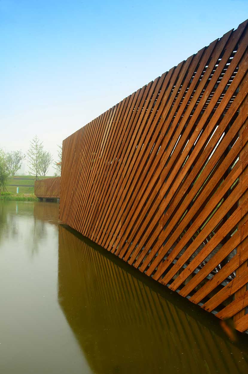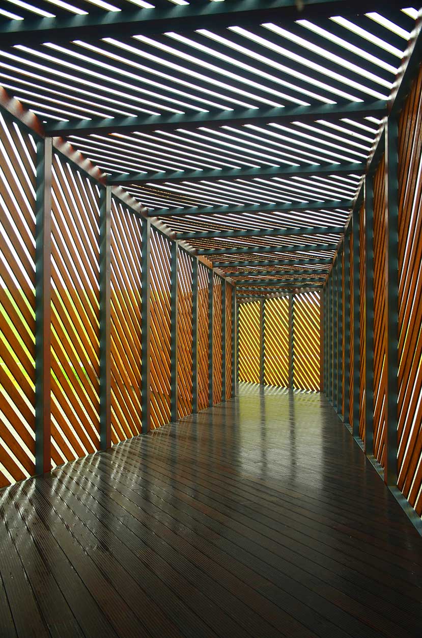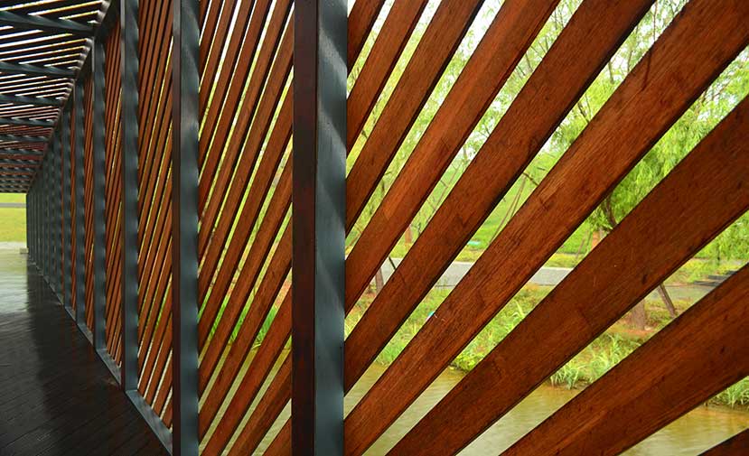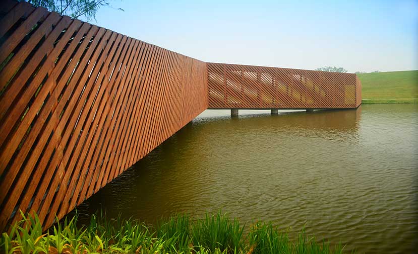 該景觀橋位于鄭州正弘中央公園內(nèi),主體為鋼架結(jié)構(gòu),運用桃花江戶外高炭防腐竹地板與淺炭格柵進行造型與裝飾。景觀橋設計干練、簡約,直線條與斜線條有力的勾勒與極具親和力的戶外竹材表達使得景觀橋極具北歐風情,成為公園內(nèi)的景觀核心。