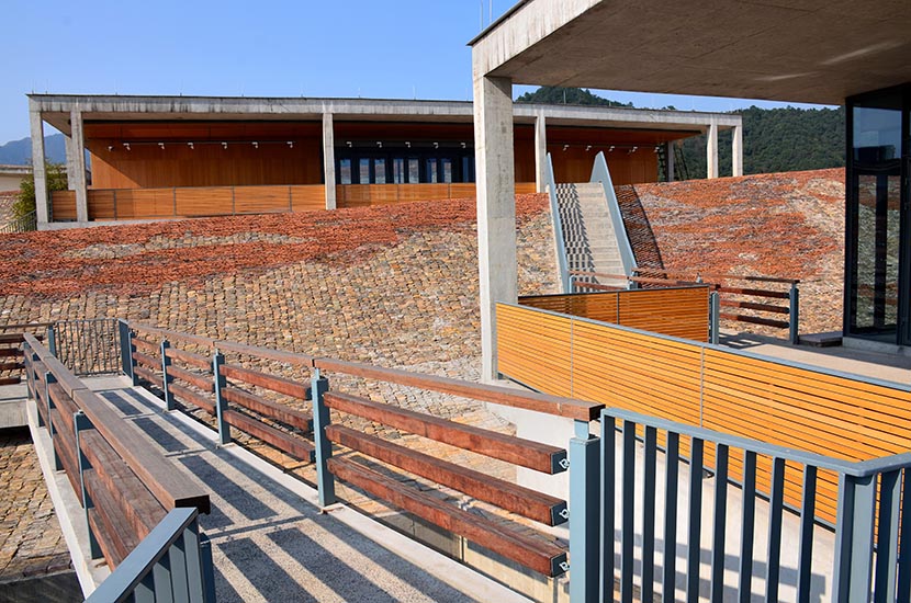 富陽公望美術(shù)館也叫“富春山館”,位于杭州市富陽區(qū),是集博物館、美術(shù)館、檔案館“三館合一”的建筑綜合體,由著名設計大師王澍設計。大師以蘇東坡《題西林壁》里的描繪為靈感來源,按照中國傳統(tǒng)的山水序列,建筑整體構(gòu)筑中呈現(xiàn)近山、遠山瀠洄呼應的構(gòu)筑法則和“三遠”視角,與咫尺之遙的富春山水互相輝映。美術(shù)館設計成內(nèi)山和外山,站在屋頂會看到一整片美術(shù)館都是外山,而頂上兩件小居,正是設計師心中的富春山居。