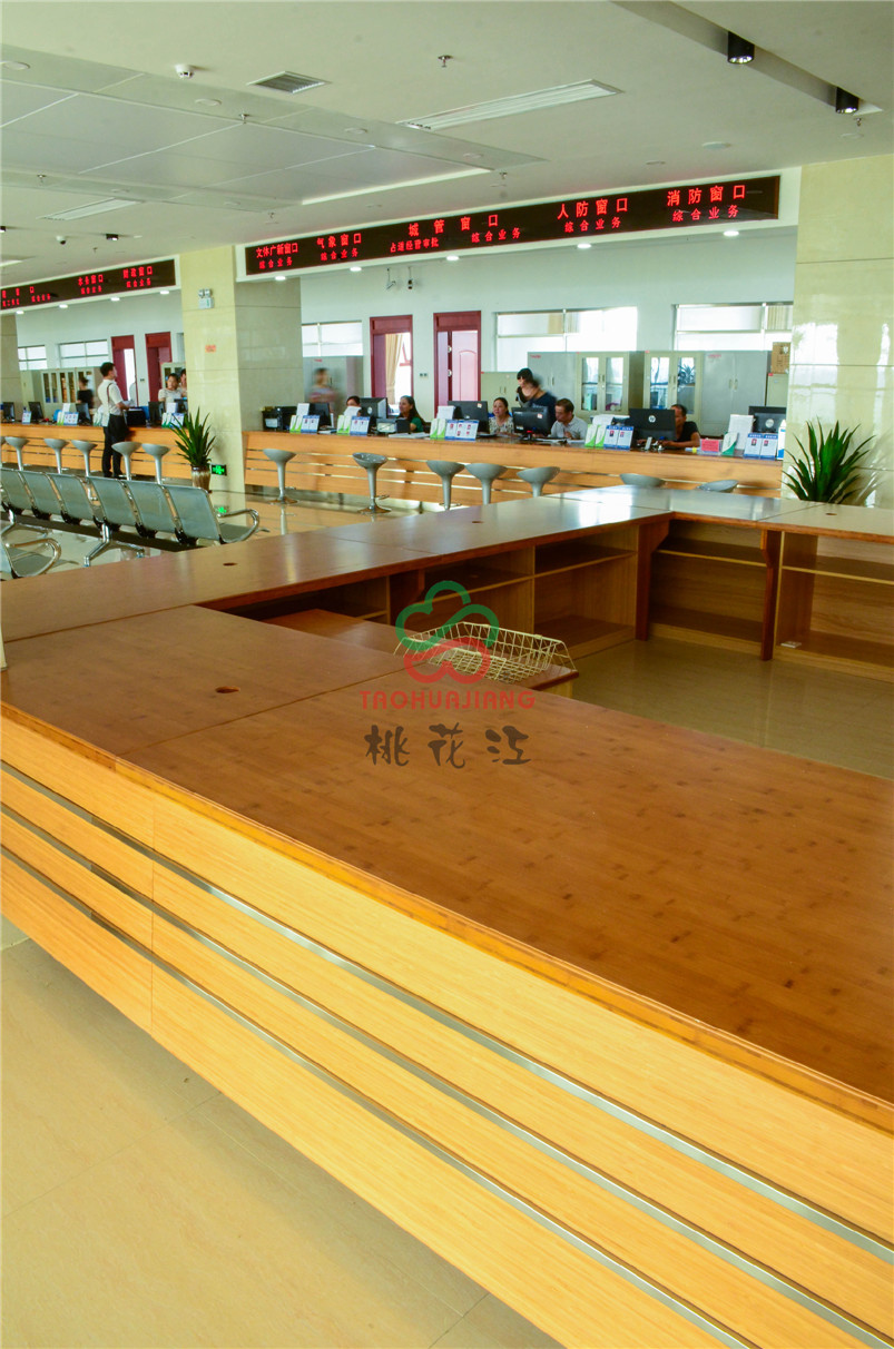 桃江縣政務(wù)服務(wù)中心是桃江縣委、縣政府為了優(yōu)化投資環(huán)境、提高辦事效率、更好地為廣大群眾和投資者服務(wù)而設(shè)立的正科級(jí)事業(yè)機(jī)構(gòu)。政務(wù)中心大廳內(nèi)的辦公桌全部使用桃花江竹材科技的普竹材料打造,色澤鮮明,質(zhì)地環(huán)保,整體感覺簡(jiǎn)約清新。竹材清正廉潔的高貴品質(zhì)正好與政務(wù)中心的宗旨:陽光行政、勤廉公平、服務(wù)至上、便民利民相互呼應(yīng)。