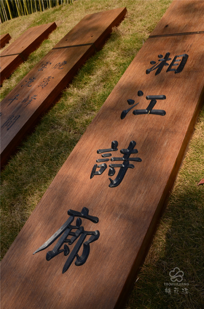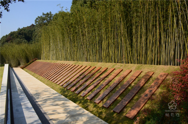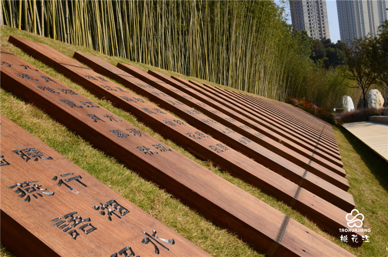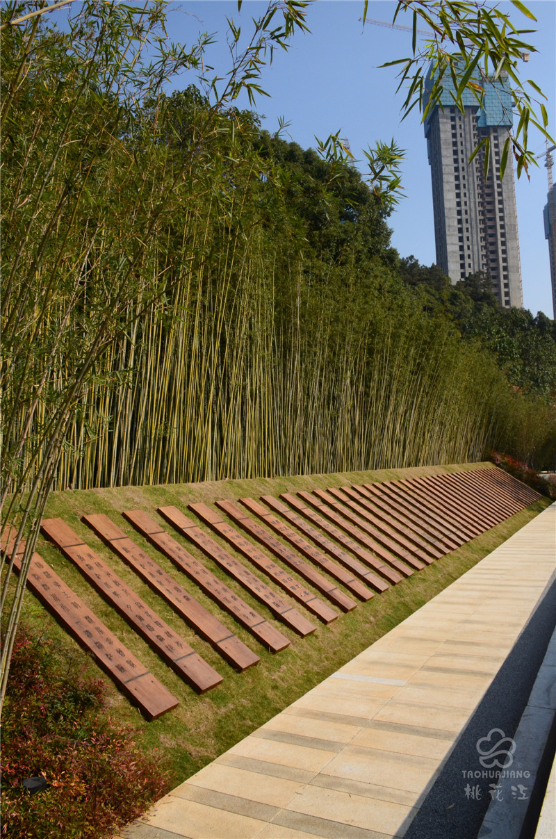 湘江詩(shī)廊位于長(zhǎng)沙開(kāi)福區(qū)金霞組團(tuán)鵝羊山公園,臨湘江北路段,總面積約6000平方米。湘江詩(shī)廊種植了大面積的景觀竹,清新自然又別具一格,雕刻詩(shī)集的板材均來(lái)自于湖南桃花江竹材科技股份有限公司生產(chǎn)的高炭防腐戶外竹材。戶外竹材自然環(huán)保,色澤古樸,性能穩(wěn)定,將詩(shī)集刻在竹板上,更加彰顯出歷史文化的厚重感和湖湘文化精神面貌。新鮮翠綠的景觀竹和加工后的重組竹板還有精心雕刻的詩(shī)集三者渾然一體,體現(xiàn)了自然山水與人文精神的融合。