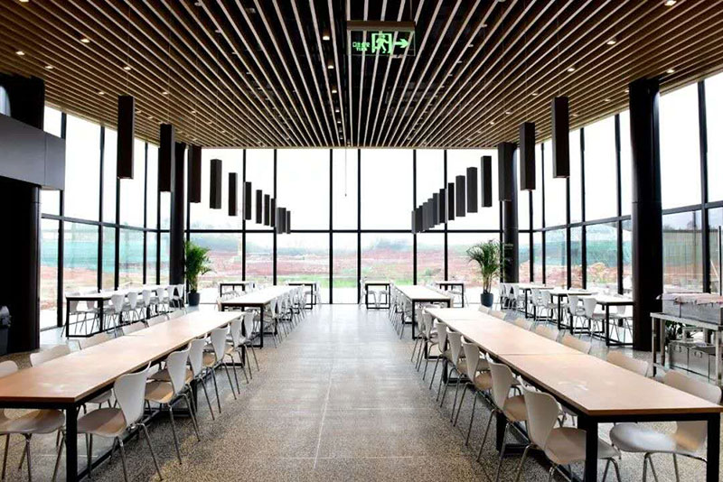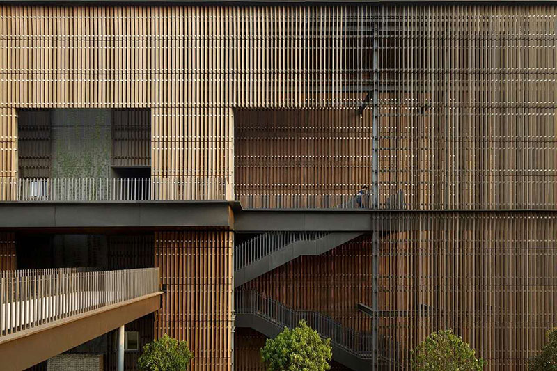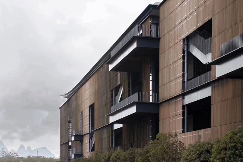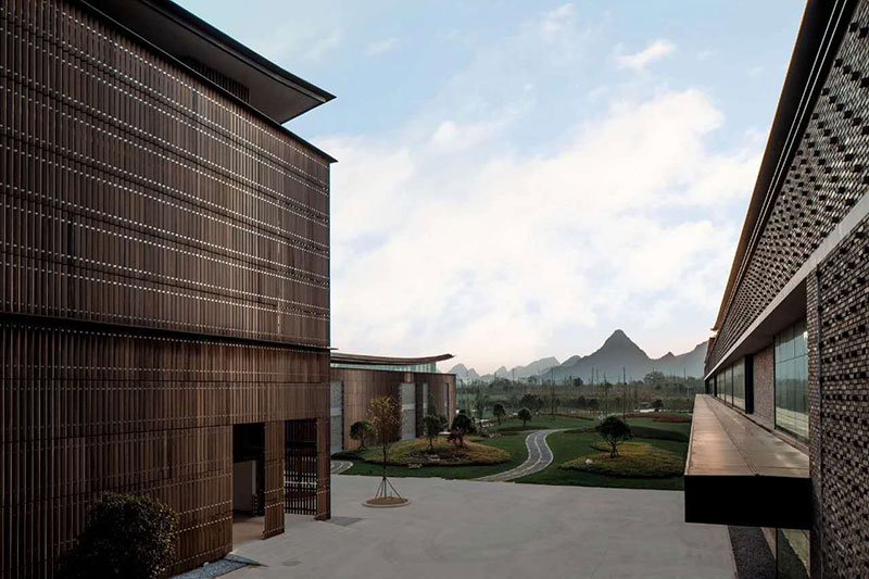 桂林溢達(dá)九美橋(又稱(chēng)十如)時(shí)尚園位于桂林市象山區(qū)九美橋一帶,是香港溢達(dá)集團(tuán)承債式整體重組桂林銀海紡織集團(tuán)公司后實(shí)施的綠色工廠項(xiàng)目。項(xiàng)目外墻、欄桿和天花吊頂使用的環(huán)保竹木格柵兼來(lái)自于桃花江竹材,顏色厚重雅致,質(zhì)感天然,疏密有致,既美觀又充分彰顯了綠色環(huán)保、低碳節(jié)能和可持續(xù)發(fā)展的理念。