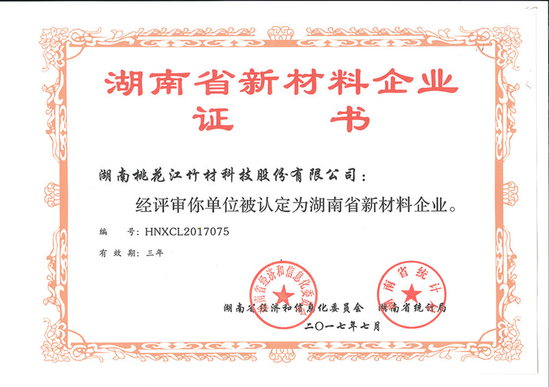 2017年7月,湖南省經(jīng)濟(jì)和信息化委員會、湖南省統(tǒng)計局為湖南桃花江竹材科技股份有限公司正式頒發(fā)“湖南省新材料企業(yè)”證書(證書編號:HNXCL2017075)。湖南省新材料企業(yè)的認(rèn)定,標(biāo)志著湖南桃花江竹材科技在新型竹材領(lǐng)域的成績得到國家認(rèn)可與支持,是一項極具含金量的突破性榮譽。作為中國竹業(yè)龍頭企業(yè),湖南桃花江竹材科技一直走在新型竹材研發(fā)、運用和推廣的前沿,為全球竹產(chǎn)業(yè)的發(fā)展持續(xù)貢獻(xiàn)力量。